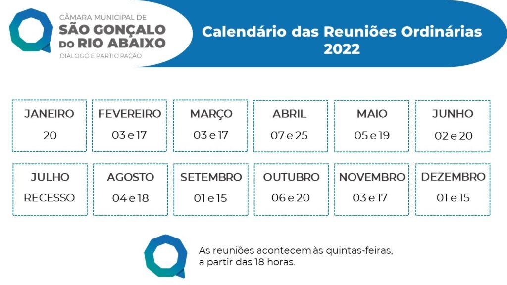 No dia 3 janeiro, o Presidente da Câmara Municipal de São Gonçalo do Rio Abaixo, vereador Diego José Ribeiro (PDT), assinou a Portaria nº 01/2022, que define todas as datas em que serão realizadas as reuniões ordinárias dos vereadores ao longo deste ano.