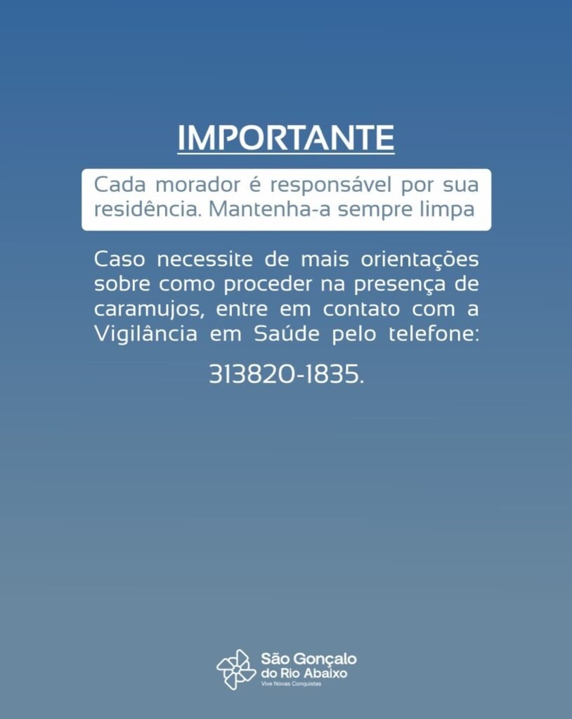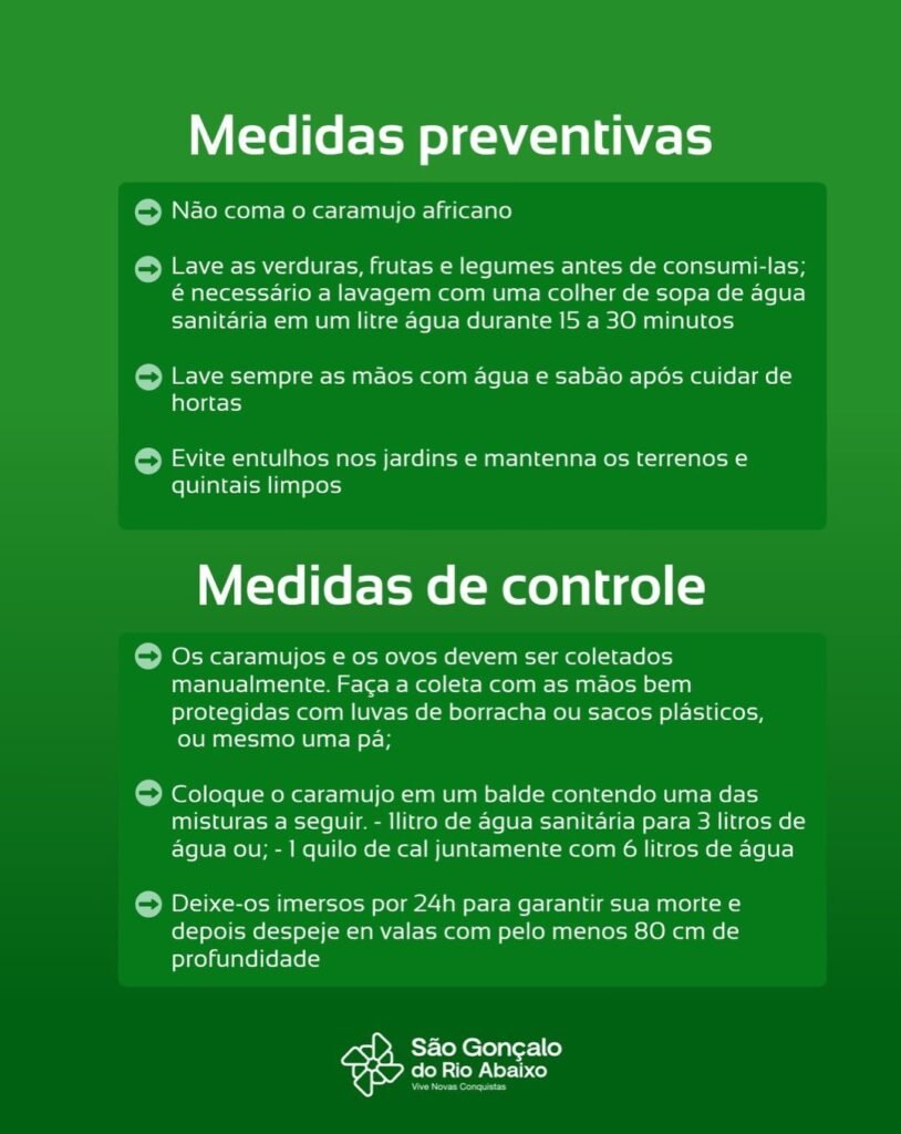 Se encontrar caramujos africanos em sua residência ou lote, faça a coleta com luvas ou sacos plásticos, coloque em recipiente fechado com sal ou solução de água sanitária e comunique a vigilância sanitária.